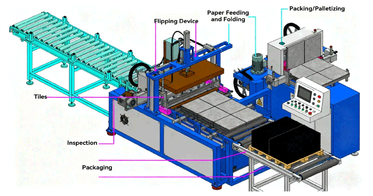 Tile packaging machinery mainly consists of a conveying system, a detection mechanism, a turning device, a paper feeding and folding assembly, a packaging mechanism, and a control system.