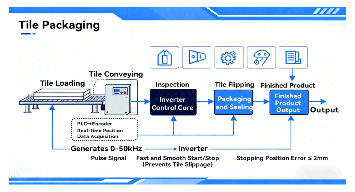 The domestic tile packaging process encompasses tile loading, inspection, and turning, with the tile conveying process placing the highest demands on inverter control. During conveying, the inverter must start and stop quickly and smoothly to prevent tile slippage, and the stopping position error must be within 2 millimeters to ensure smooth operation and aesthetically pleasing packaging.