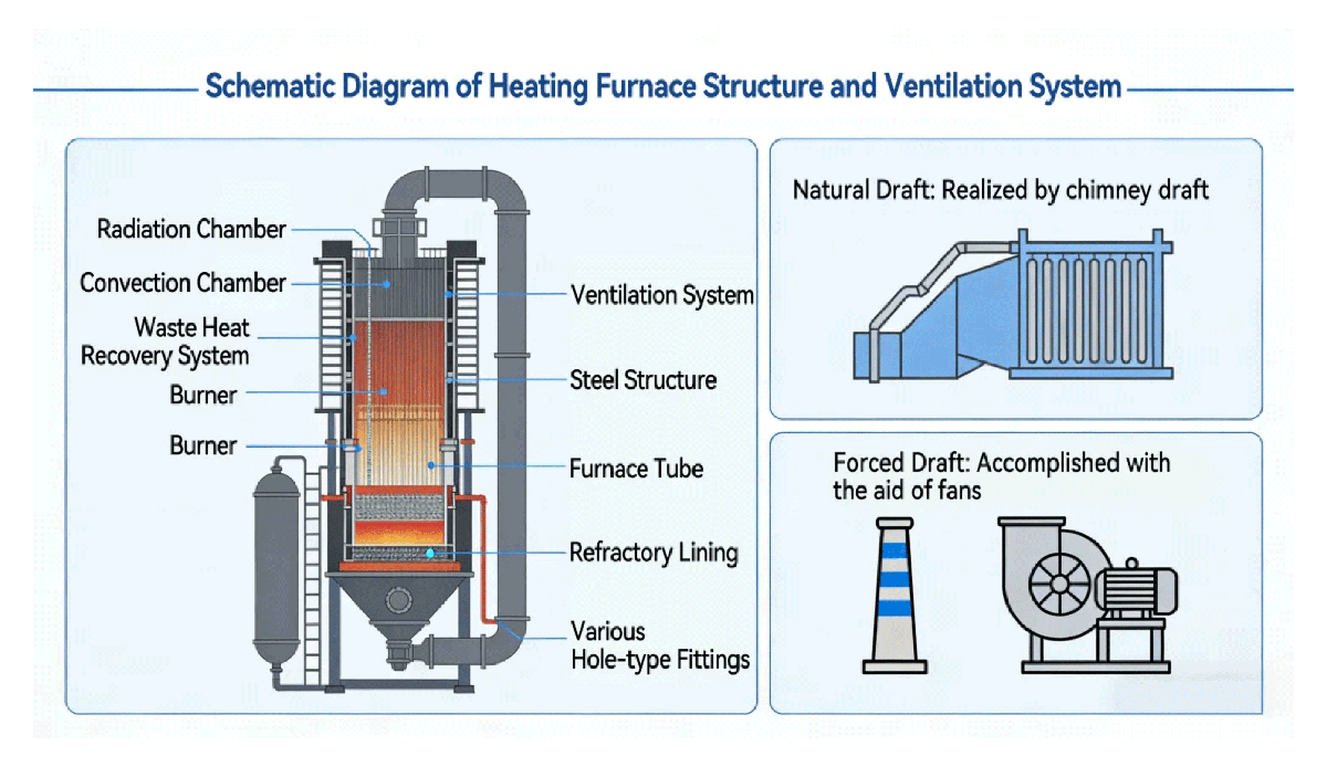 A heating furnace is mainly composed of five parts: a radiation chamber, a convection chamber, a waste heat recovery system, a burner, and a ventilation system. Its overall structure also includes a steel structure, furnace tubes, furnace linings, burners, and various types of hole accessories. The ventilation system is responsible for supplying combustion-supporting air and exhausting waste flue gas, and it is divided into two types: natural ventilation and forced ventilation. Natural ventilation is achieved by means of chimney draft, while forced ventilation is accomplished with the help of a fan.