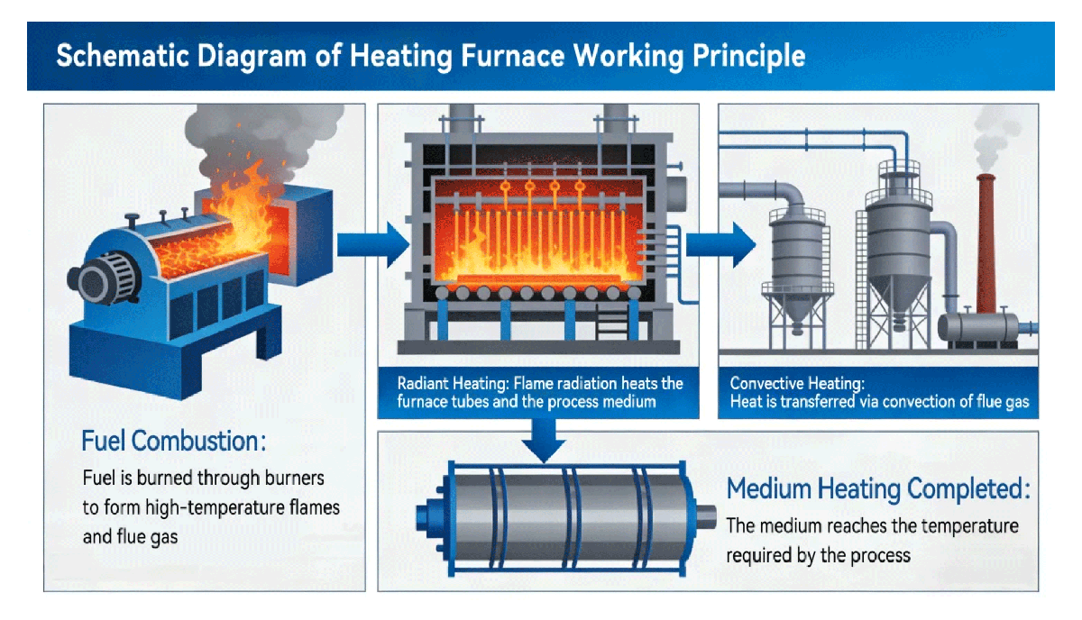 The heating furnace uses high-temperature flames and flue gas generated by fuel combustion as heat sources to heat the medium flowing inside the furnace tubes, bringing it to the temperature required by the process. After the fuel is burned by the burner, high-temperature flames and flue gas are formed. The flames heat the furnace tubes and the internal medium in the radiant chamber through radiation; the flue gas enters the convection chamber under the action of the chimney draft or induced draft fan, and then transfers heat through convection, ultimately completing the heating of the medium.