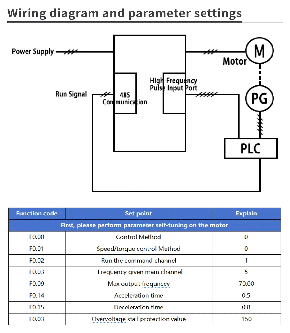To guarantee consistent stopping positions, the inverter needs to work in conjunction with a PLC and encoder. The PLC calculates the tile position using the encoder and sends a 0-50kHz pulse signal to the inverter.
