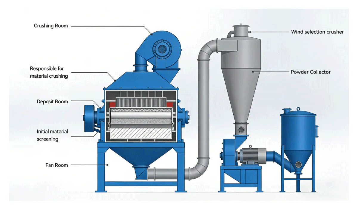 The winnowing crusher comprises five core components: the main unit, fan, separator, powder collector,and dust remover.The main unit serves as the central module, housing three distinct functional chambers internally: the crushing chamber responsible for material size reduction, the screening chamber for preliminary particle classification, and the fan chamber dedicated to pneumatic conveyance. These integrated subsystems operate synergistically to accomplish the complete powder production workflow.