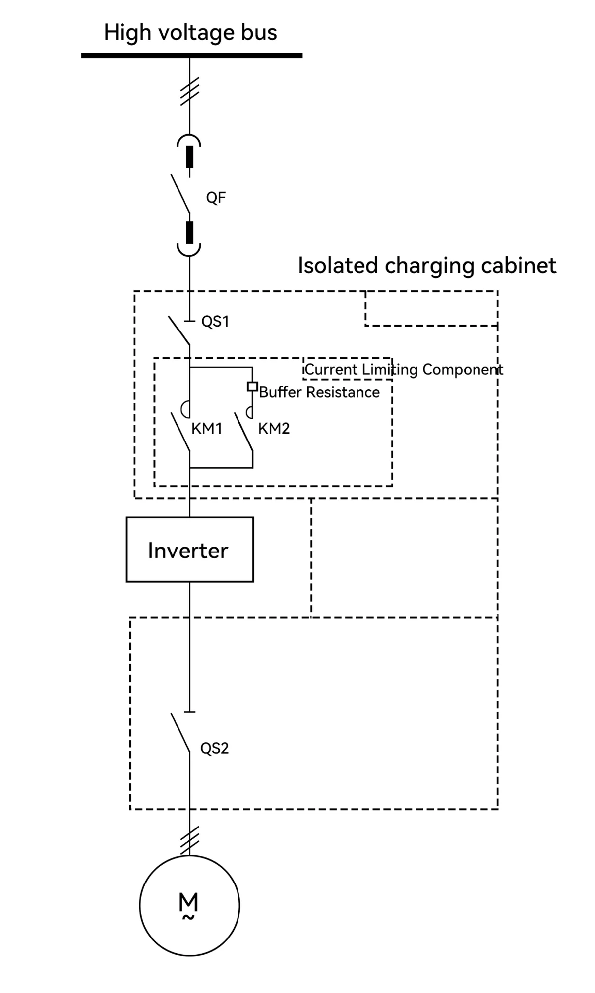 Given the limited on-site grid capacity and the high power rating of the motor, a charging resistor is incorporated into the main circuit to mitigate inrush current during energization and control the voltage drop across the bus.