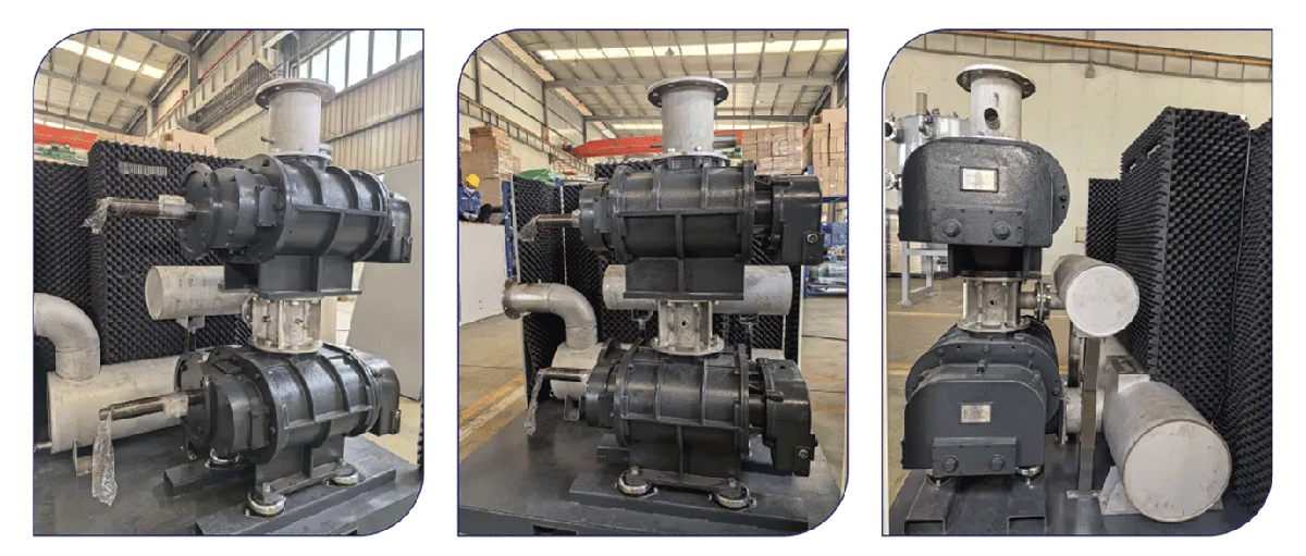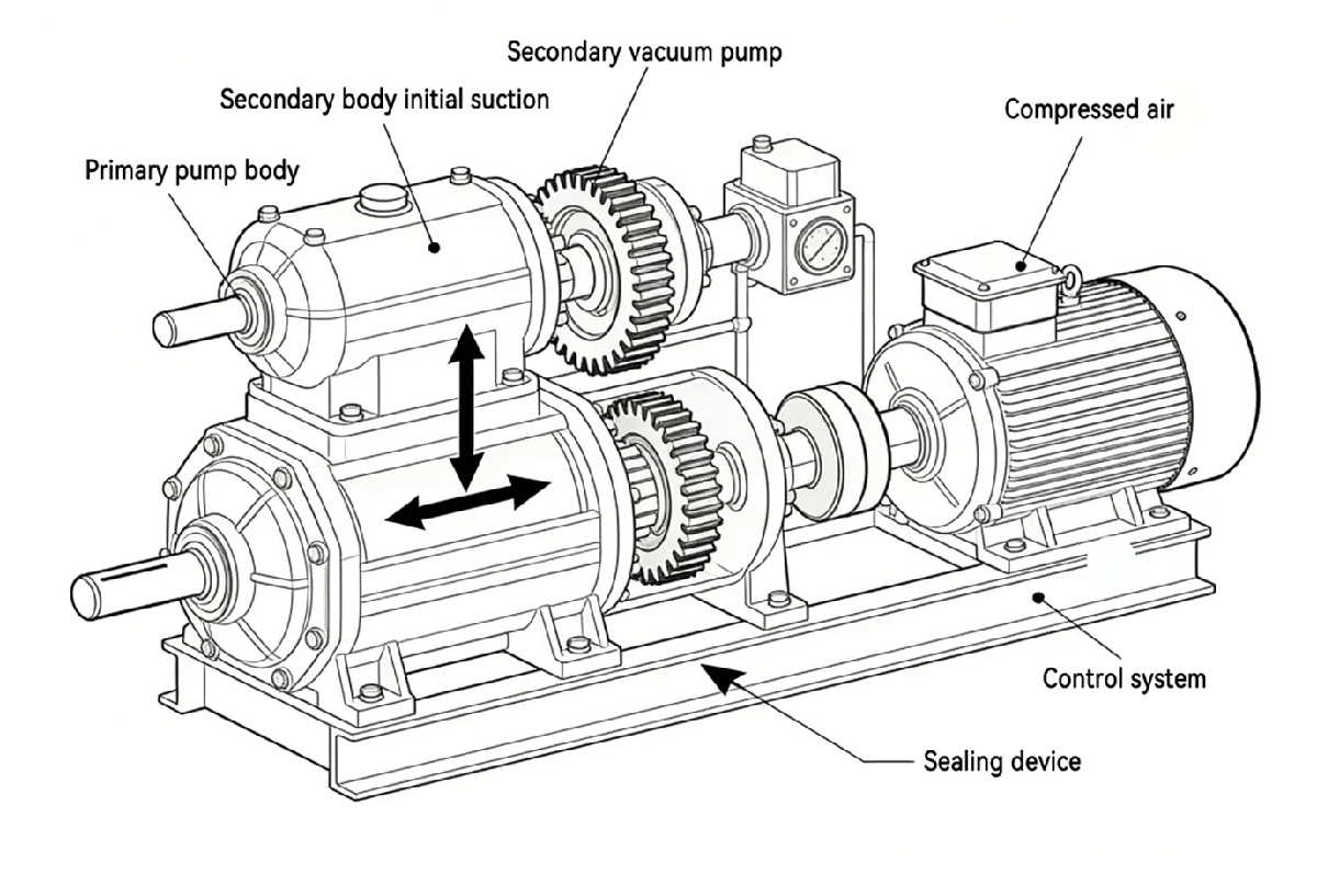 The core assembly of the two-stage vacuum pump consists of a primary pump body, a secondary pump body, transmission gears, an electric motor, sealing mechanisms, and a control system. The primary pump body is responsible for initial evacuation to establish a fundamental vacuum environment, while the secondary pump body further compresses gases to enhance the vacuum level. The electric motor serves as the power core, and the FR500 inverter ensures precise rotational speed regulation. All components work in coordination to achieve efficient and stable vacuum extraction operations.