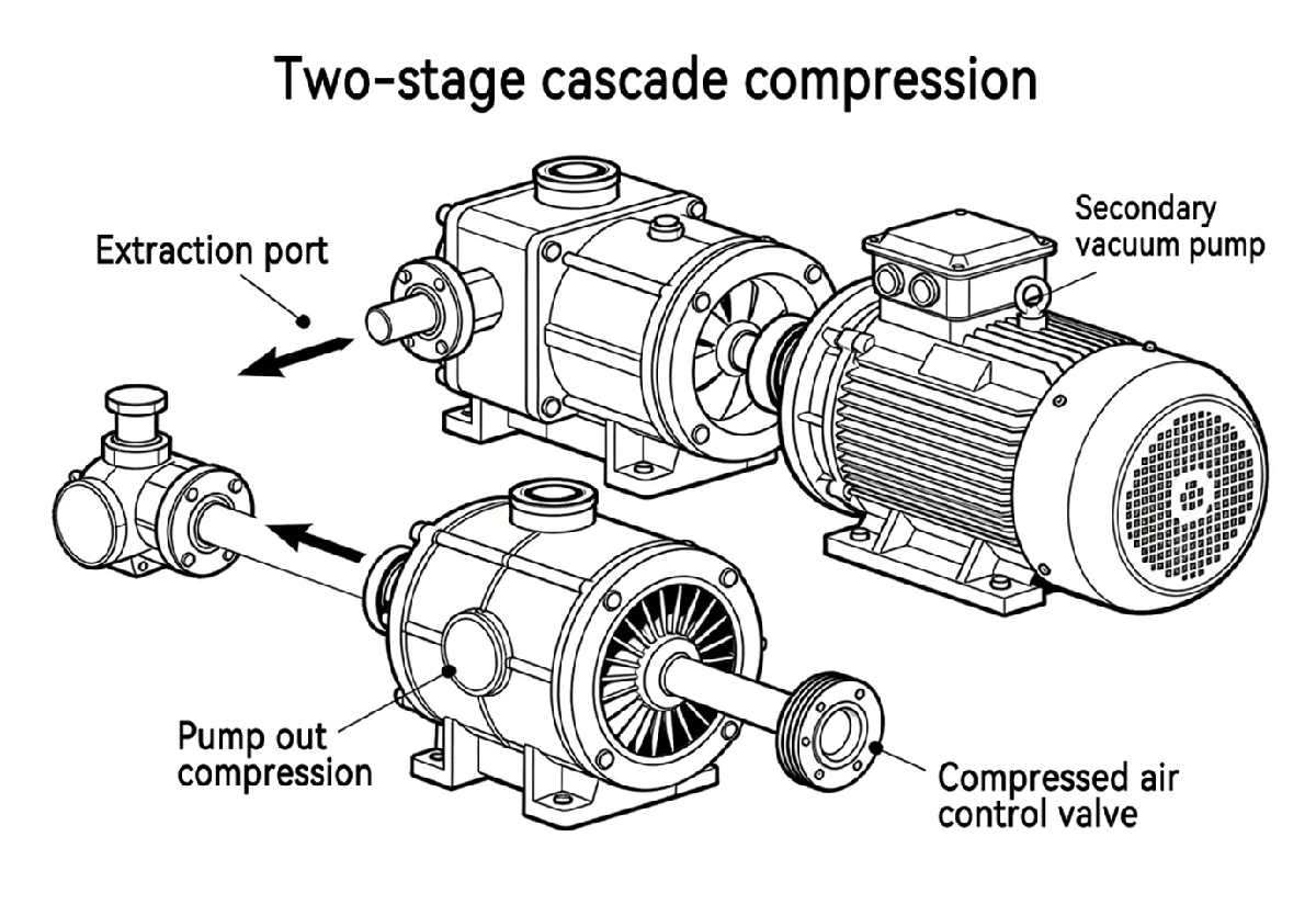 Two-stage vacuum pumps operate based on the "two-stage series compression" principle. Upon activation, the motor drives the impeller of the first-stage pump to rotate, drawing in gas from the vacuum environment and performing preliminary compression. The compressed gas then enters the second-stage pump, where it undergoes further compression before being discharged. This progressive two-stage compression mechanism enables the delivery of high vacuum levels. The vacuum degree and pumping speed can be precisely regulated by adjusting the motor speed, as there is a linear correlation between speed and vacuum level, allowing adaptation to varying operational requirements.