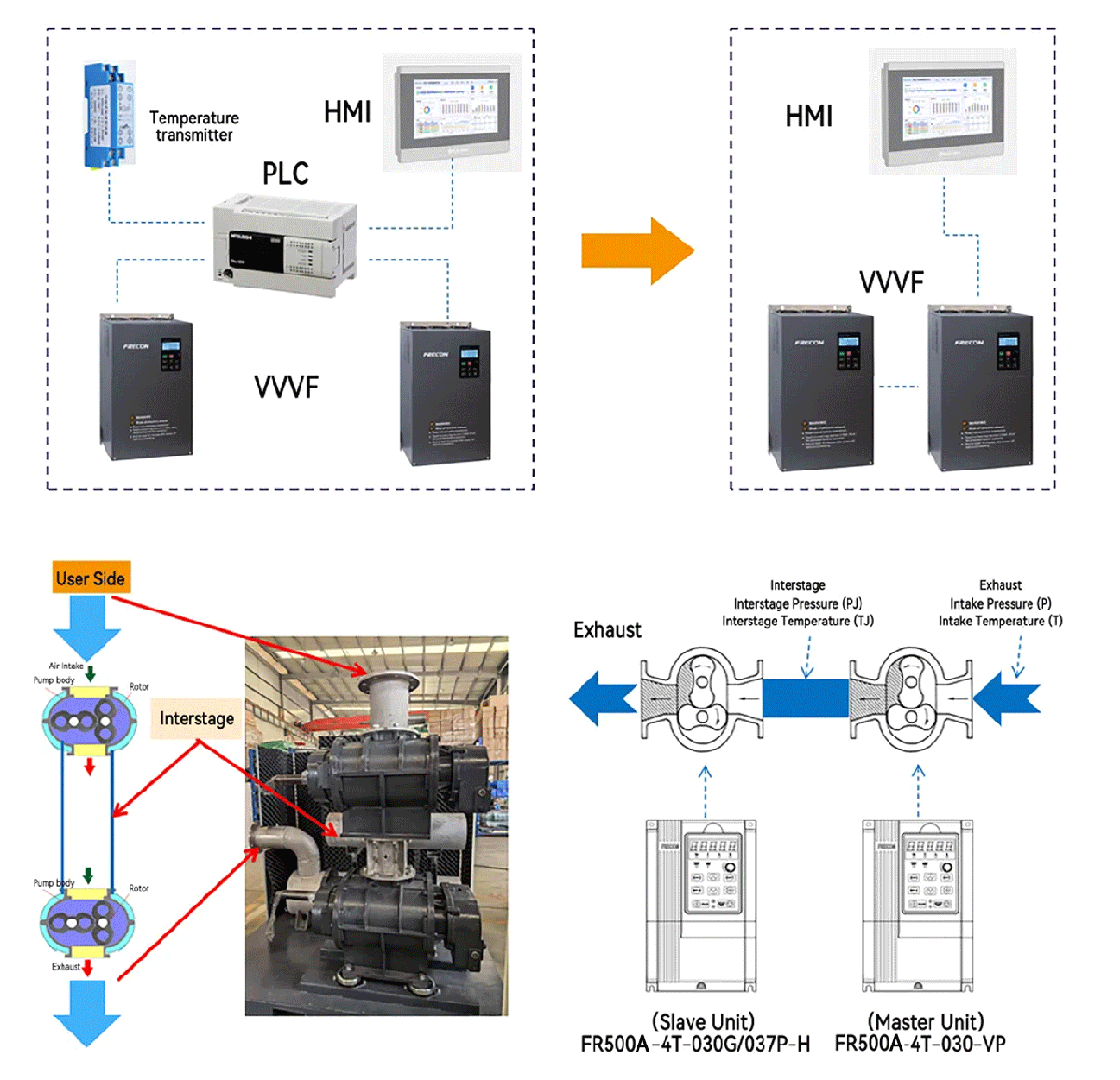 In response to the high-load characteristics and precise pressure control requirements of the two-stage vacuum pump, the user has carried out system renovation with the FR500 inverter from FRECON. The core circuit design is as follows: (Note: This can be replaced with an actual wiring diagram. The core circuit includes: three-phase 380V power supply → circuit breaker → FR500 inverter → motor → vacuum sensor → PLC / control system → FR500 feedback interface)