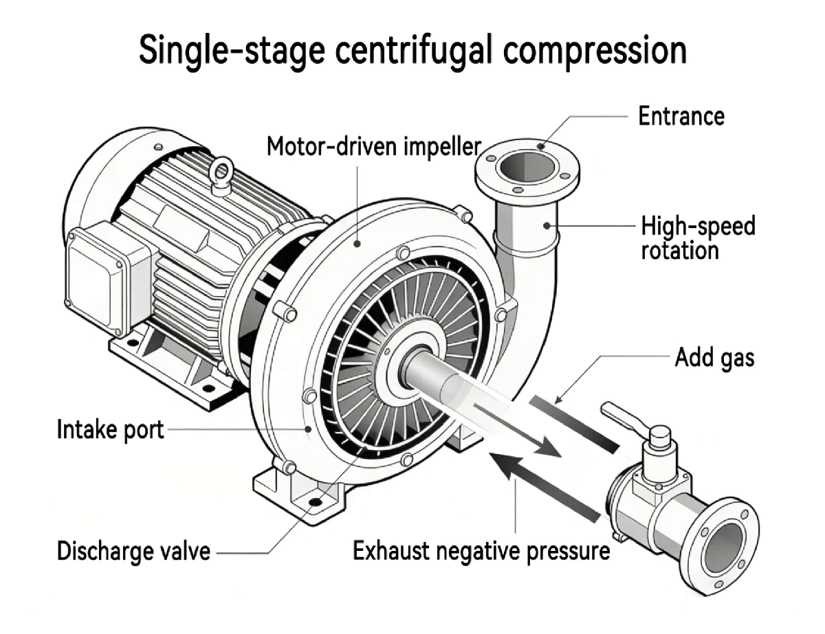A single-stage vacuum pump operates on the principle of "single-stage centrifugal compression." When driven by an electric motor at high speed, the impeller creates a negative pressure inside the pump housing, drawing gas from the vacuum environment through the intake port. The gas is then compressed by centrifugal force exerted by the impeller, and after its pressure increases, it is discharged through the exhaust valve, thereby establishing a stable vacuum. By adjusting the motor speed, the pump enables stepless regulation of both pumping speed and vacuum degree, accommodating various operational requirements—such as low vacuum for food packaging and medium-to-high vacuum for pharmaceutical drying processes.