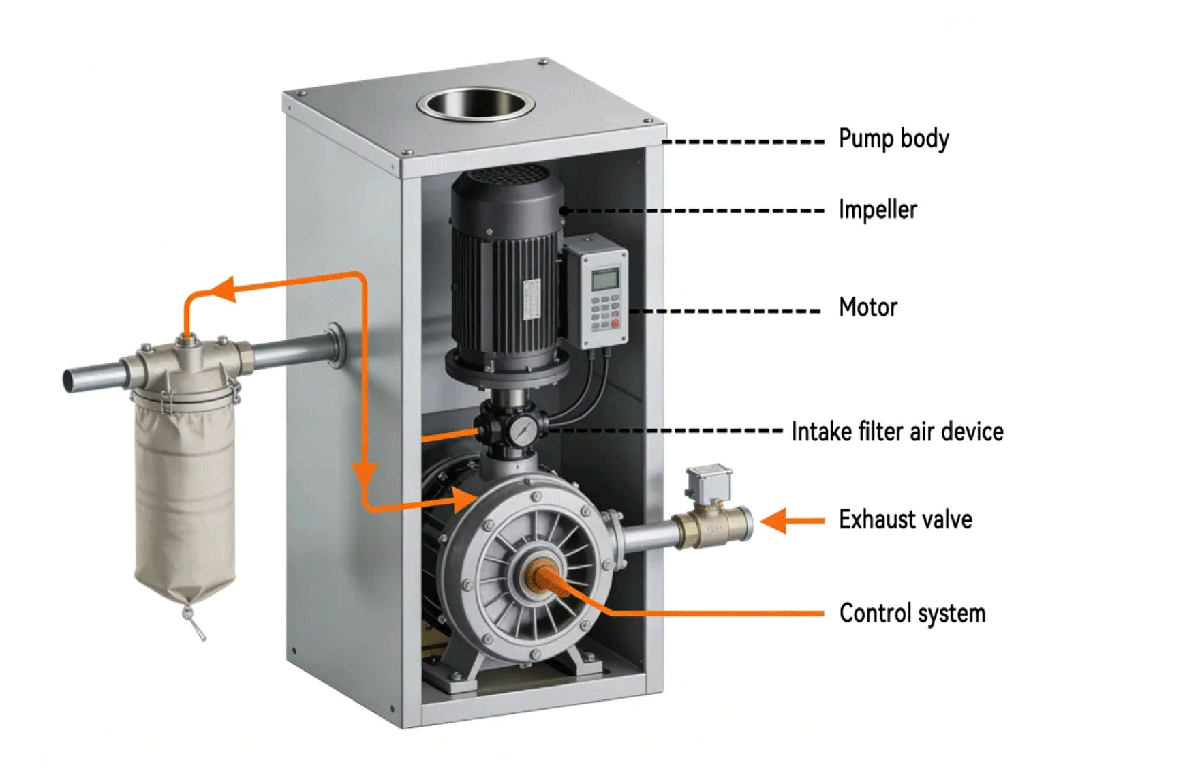 The core components of a single-stage vacuum pump include the pump body, impeller, motor, intake air filter, exhaust valve and control system. The pump body serves as the core for gas compression. The rotation of the impeller achieves gas suction and compression. The motor provides power output. The FR500A inverter is responsible for precise speed control. The intake air filter ensures the cleanliness of the gas. The coordinated operation of all components enables stable vacuum extraction.