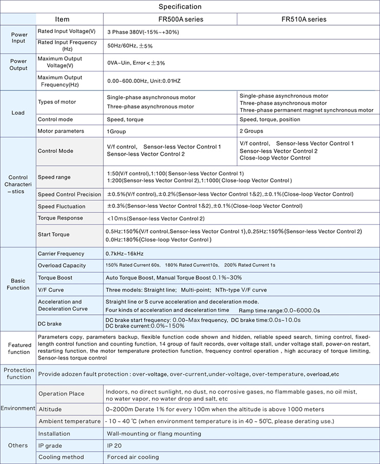 Compared with the FR500A series, the FR510A series variable frequency drive for 3 phase motor offers enhanced motor compatibility, higher control precision, and greater application flexibility, making it more suitable for complex industrial control scenarios.